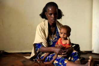 A mother holds her severely malnourished son at…